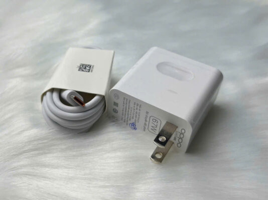 Cáp đi kèm là USB-A sang USB-C, dây dày, chắc chắn, lớp bọc ngoài mềm nhưng bền. Phần đầu cáp được thiết kế đỏ bên trong – dấu hiệu nhận diện của dòng sạc nhanh OPPO.